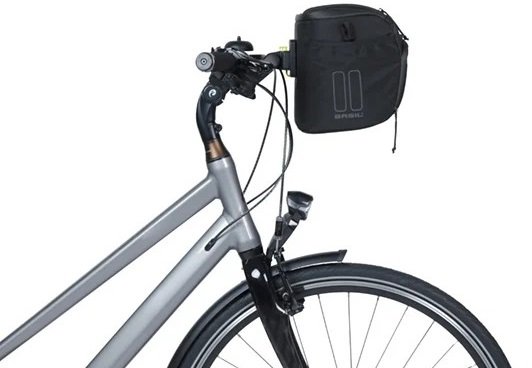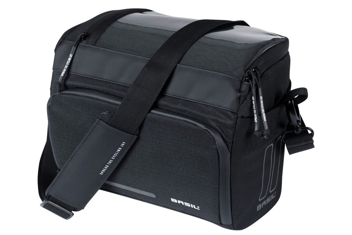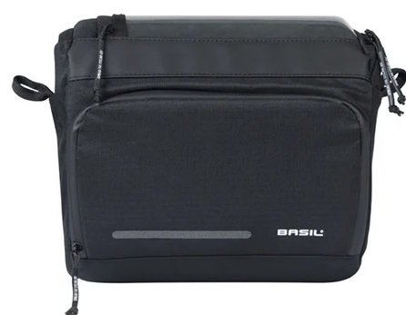 Basil Move stuurtas, waterafstotend gerecycled polyester, div. vakken, klep met waterdichte transparante map voor smartphone, schouderriem, geschikt voor KF systemen (niet inbegrepen), reflectie, 7-8L, zwart