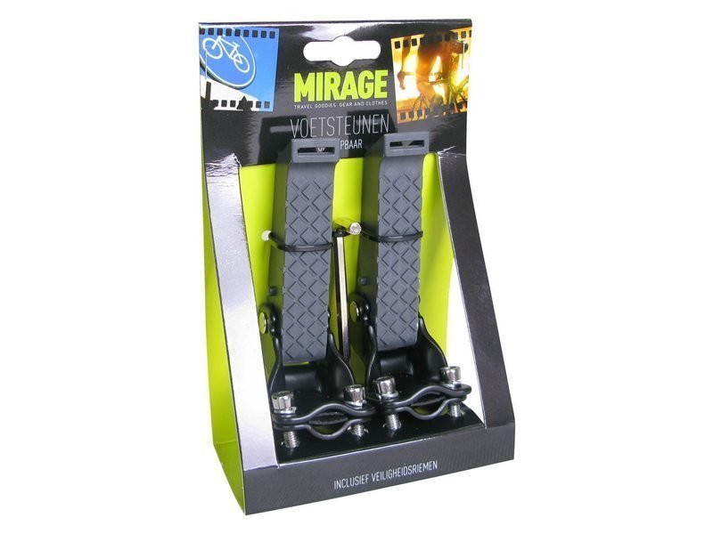 Mirage opklapbare voetsteunen voor bevestiging aan de achtervork, voorzien van veiligheidsriemen, borgpin om de voetsteunen opklapbaar te hoeden, antislip op de voeststeun, RVS bouten, inbussleutel