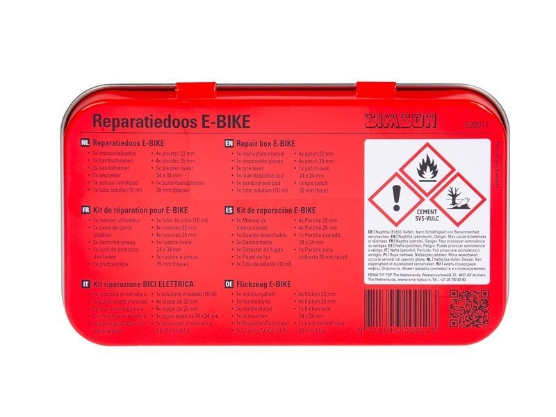 De inhoud van de Simson reparatiedoos E-bike is goed voor 10 plakbeurten en bestaat uit: 1 x instructieboekje, 1 x handschoenen, 3 x bandafnemer, 1 x lekzoeker, 1 x schuur-/strijkpad, 1 x tube solutie (10 ml), 4 x pleister 22mm, 4 x pleister 25mm, 1 x pleister ovaal 24 x 34 mm en 1 x buitenbandpleister 35mm (blauw).